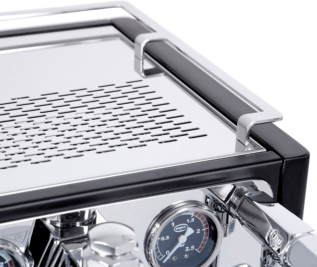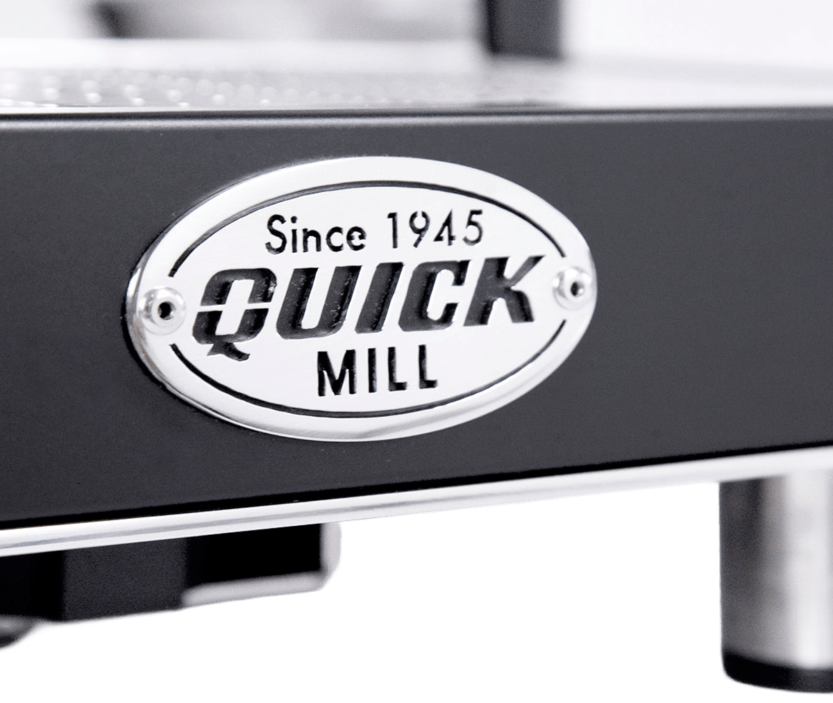 Helrostfri konstruktion med djupa svarta detaljer, joystick-tappar och Quick Mill-bryggrupp ger ett professionellt visuellt uttryck som passar både kök och arbetsplats.