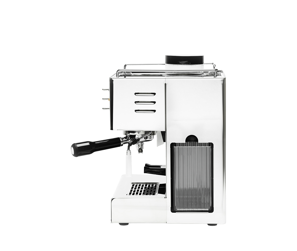 Maskinen styrs med klassiska spakreglage, tydliga indikatorlampor och en integrerad tamper. Sidotanken på 1,8 liter gör påfyllning enkel och smidig.
