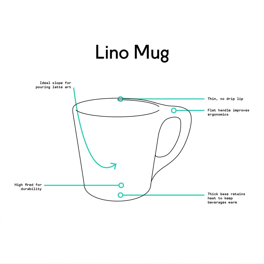 - Tillgängliga versioner i Lino-serien: Espressokopp 9 cl, cappuccinokopp 18 cl, latte-koppar 24 cl och 36 cl, kaffekopp 30 cl, pulled-tallrikar, mjölkkanna och färgglada muggar