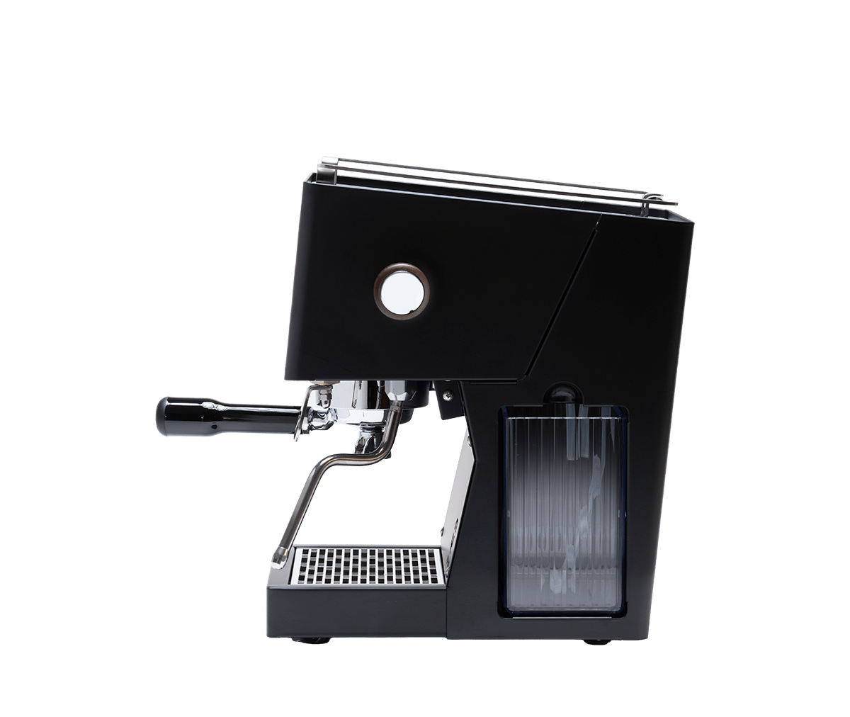 Maskinen finns i rostfritt eller matt svart, båda med trädetaljer på ångratt och portafilter. Ring brew group ger konsekvent värme och pålitlig byggkvalitet.